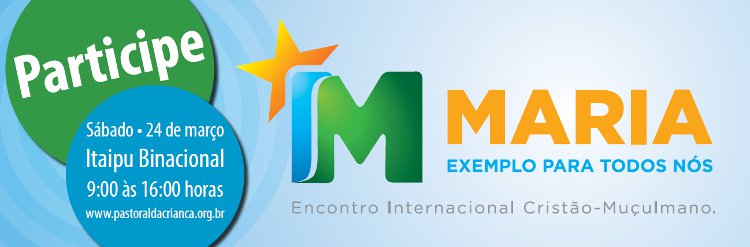 A Coordenação da Pastoral da Criança Internacional, em conjunto com a Conferência Nacional dos Bispos do Brasil, representantes da Liga da Juventude Islâmica Beneficente do Brasil, da União Nacional das Entidades Islâmicas e da Comunidade Islâmica de Foz do Iguaçu, promove o evento MARIA, EXEMPLO PARA TODOS NÓS – Encontro Internacional Cristão-Muçulmano no sábado, dia 24 de março, na área da Itaipu Binacional, em Foz do Iguaçu (PR).