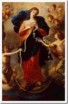 Maria é representada como a Imaculada Conceição e encontra-se entre o céu e a terra. O Espírito Santo derrama sua luzes sobre a Virgem. Em sua cabeça vemos 12 estrelas. Um dos anjos entrega-lhe uma faixa com nós grandes e pequenos, separados e juntos. Estes nós simbolizam o pecado original e nossos pecados cotidianos, que impedem de a graça frutificar em nossas vidas. Na parte inferior do quadro vemos que a faixa cai livremente e que um nó está desatado. Há um anjo, um homem e um cachorro que dirigem-se à uma igreja. Parece ser uma referência ao livro de Tobias (6,13) onde este empreende uma longa e penosa viagem quando conhece Sara que já casara sete vezes e que na noite de núpcias seus maridos morriam devido a um demônio que dela se enamorara. Tobias casa-se com ela e volta à casa de seu pai. Isto significa que há de se desatar primeiro os nós para que dois corações venham se encontrar.