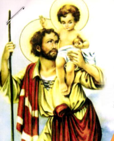 Um dia apareceu uma criança que queria atravessar o rio. Era o próprio Menino Jesus, que depois se revelou e lhe disse: “De agora em diante você vai chamar-se Cristóvão, isto é, carregador de Jesus”. É o padroeiro dos motoristas, caminhoneiros, pilotos, canoeiros e transportadores de gente porque carregou o Menino Jesus de uma à outra margem do rio.