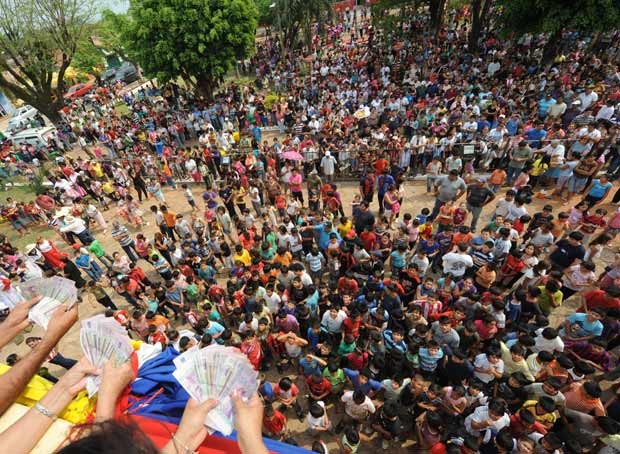 Dezenas de paraguaios se amontoaram nesta sexta-feira (7) na frente de uma igreja na cidade de Guarambaré, ao sul de Assunção, para pegar dinheiro jogado a partir do campanário em uma tradicional celebração da Natividade da Virgem Maria.